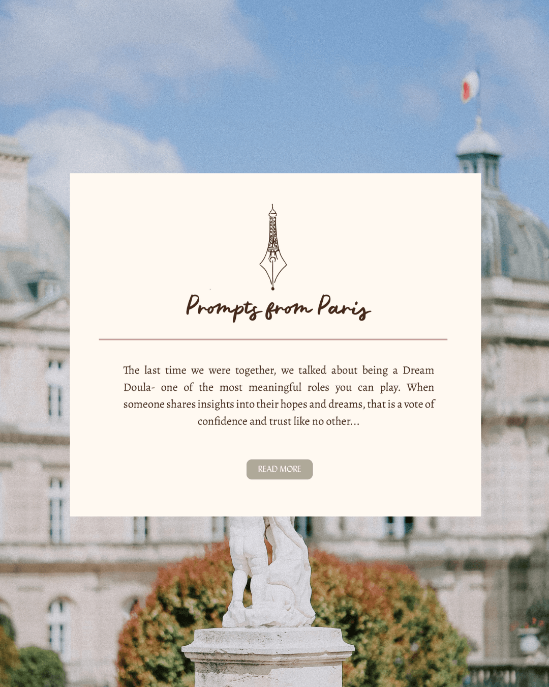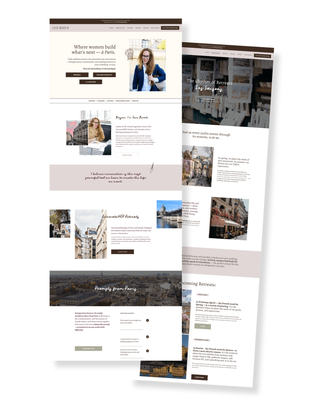 The answer was intentional structure and a lot of behind-the-scenes thinking. We built a flexible site architecture designed to grow with her — a retreat framework with a dropdown system that lets her add new offers without ever needing a redesign. Visually, the direction was editorial and timeless: sophisticated typography, soft layered palettes, spacious layouts with intentional rhythm. Paris-inspired without leaning on cliché.