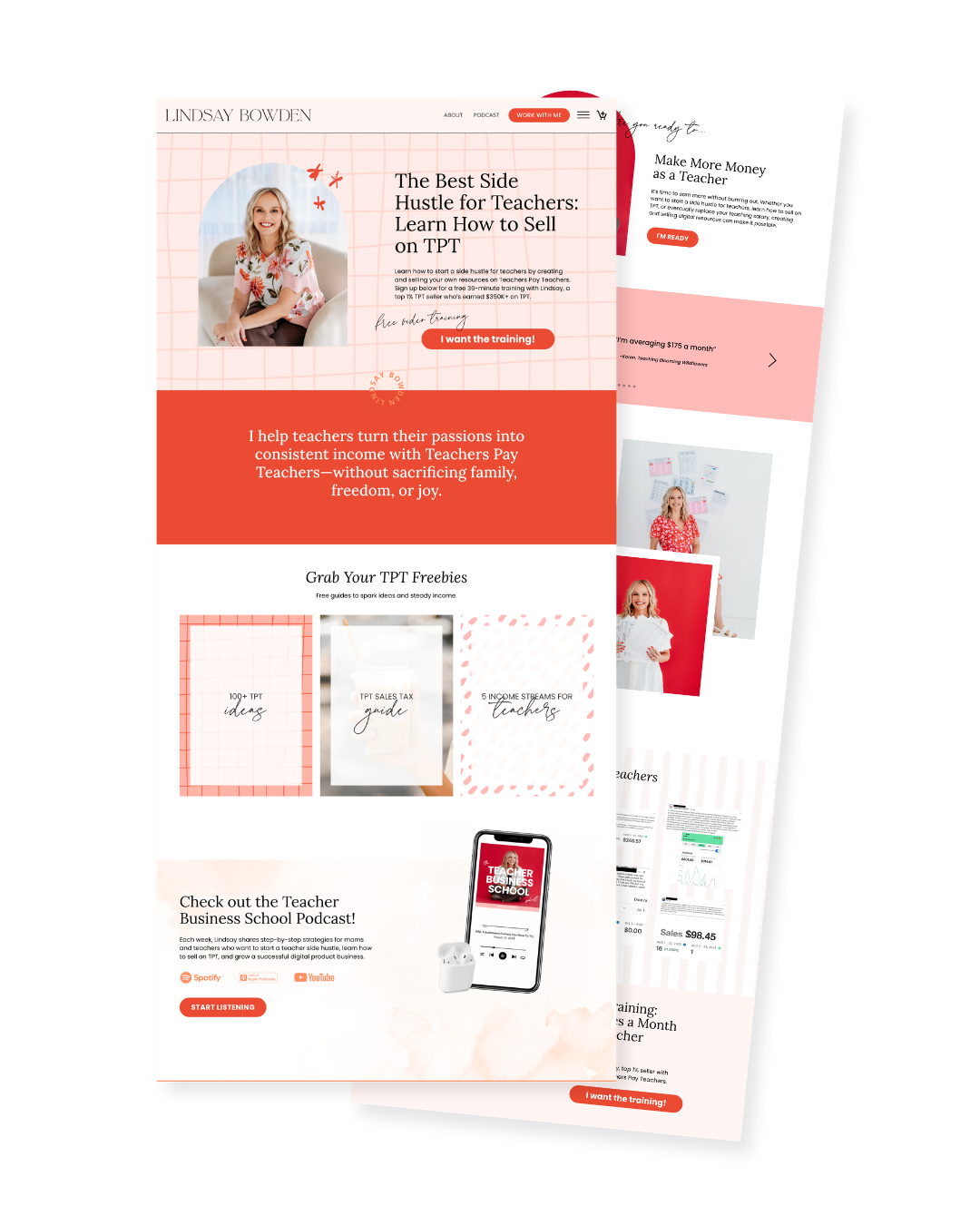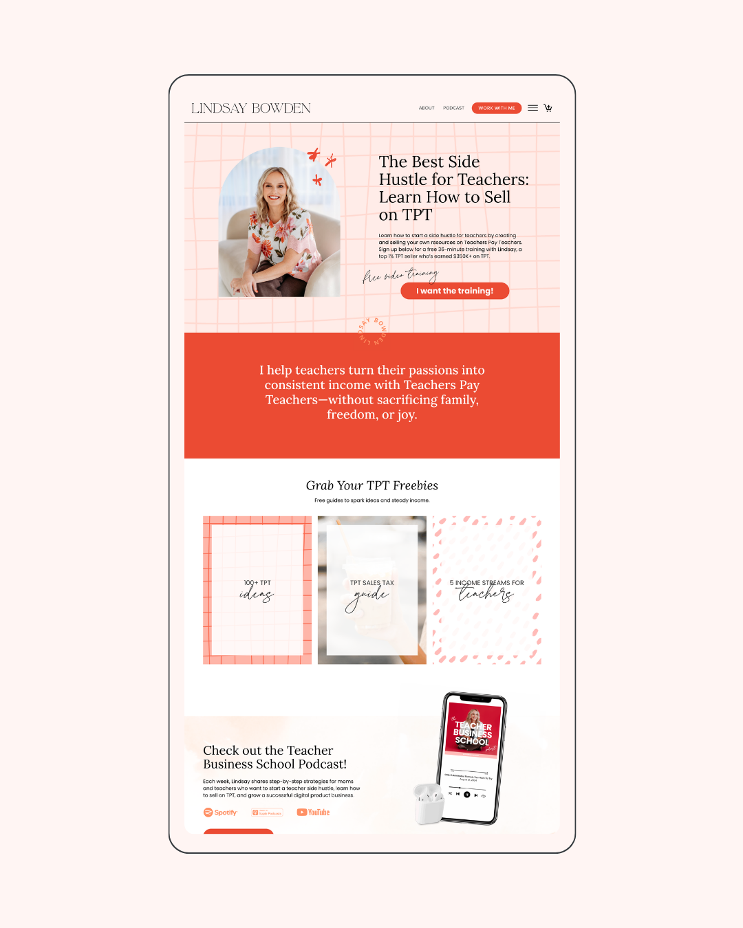 Lindsay Bowden and I have been working together for years — through rebrands, platform merges, new offers, and a bold new creative direction that has evolved her business into something that finally matches the scale of what she's built. She's a WordPress + Kajabi ecosystem running programs, a podcast, digital products, and passive income funnels — and the design has to hold all of it together at every stage.